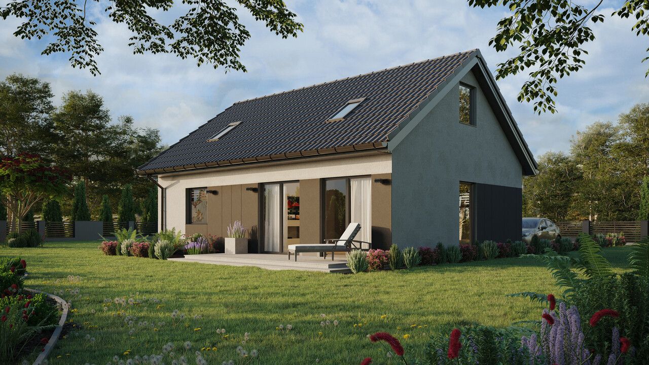 ERDOL 1 XL in der gewählten Konfiguration hat ein Satteldach mit nutzbarem Dachgeschoss mit einer Neigungswinkel 35 Grad und ist mit EUROCOLOR SYNEGO PVC-Tischlerarbeiten auf einem 80 mm breiten Profil der Marke REHAU in den Farben Anthrazit ausgestattet.