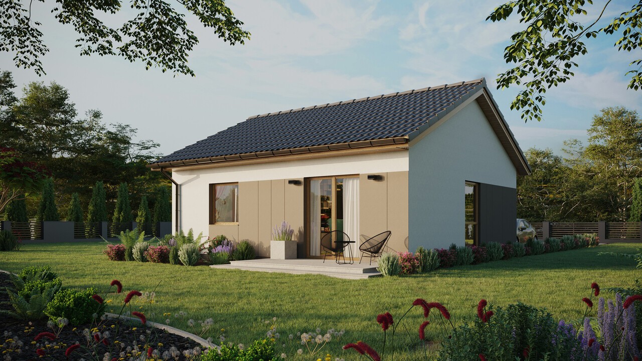 Das Haus ERDOL 1 mit einer Fläche von 59 m² (90 m² in der Version mit nutzbarem Dachgeschoss) bietet seinen Bewohnern einen komfortablen Raum, in dem alles, was sie brauchen, vorhanden ist. Seine geringe Größe macht es einfach und kostengünstig in der Instandhaltung, was in Verbindung mit den modernen und ökologischen Lösungen, die bei seiner Konstruktion verwendet wurden, die Klarheit gibt, dass dieses Haus im Einklang mit der Natur geschaffen wurde.
