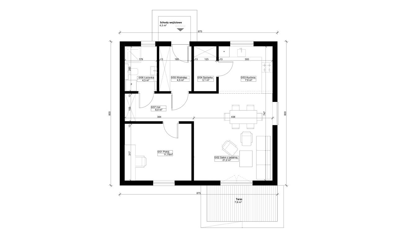 Es besteht die Möglichkeit, die Speisekammer als technischen Raum mit einem Eingang von der Seite des Vorraums zu nutzen - alle unsere Gebäude haben in der Wand von der Seite des Vorraums einen vorbereiteten Platz für die Montage der Tür, die nach der Entfernung der Paneele, die den Durchgang schließen, eingesetzt werden kann.