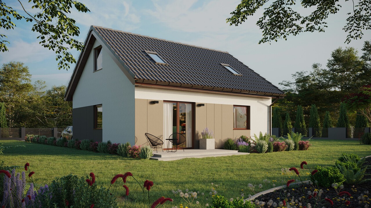 Das Haus ERDOL 1 mit einer Fläche von 59 m² (90 m² in der Version mit nutzbarem Dachgeschoss) bietet seinen Bewohnern einen komfortablen Raum, in dem alles, was sie brauchen, vorhanden ist. Seine geringe Größe macht es einfach und kostengünstig in der Instandhaltung, was in Verbindung mit den modernen und ökologischen Lösungen, die bei seiner Konstruktion verwendet wurden, die Klarheit gibt, dass dieses Haus im Einklang mit der Natur geschaffen wurde.