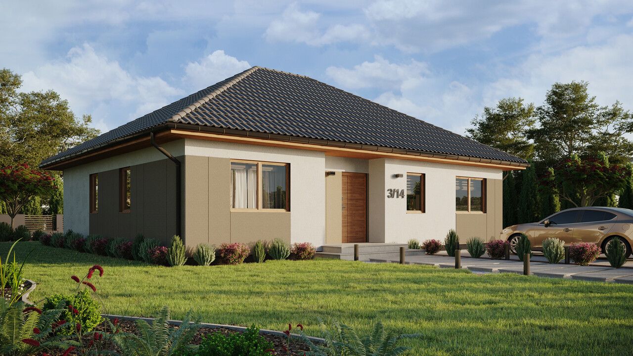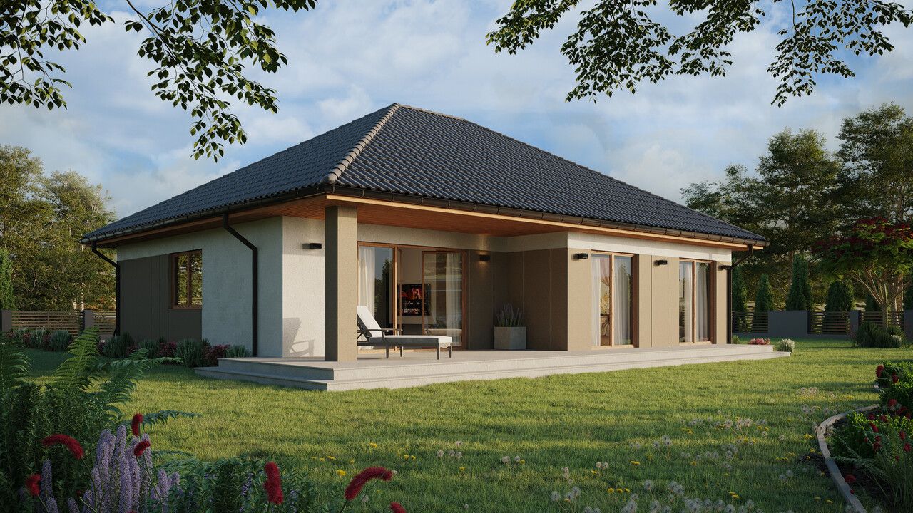 ERDOL 104, wie der Name schon sagt, hat 104 m² (plus 25 m² Dachboden) Wohnfläche. Es ist eine gute Wahl für Menschen, die ein kleines, aber sehr funktionelles Haus in einer optisch attraktiven Form mit einem eleganten Walmdach suchen. Für den alltäglichen Komfort sorgen u.a. 2 Bäder und eine Terrasse mit einem Laubengang am Eingang, dank dem man bei jedem Wetter gerne nach draußen geht. Neben dem Komfort ist das Haus auch ökologisch - die Instandhaltungskosten wurden durch den Einsatz moderner Lösungen und Materialien, die die Innenräume wirksam vor Wärmeverlusten schützen, auf ein Minimum reduziert.