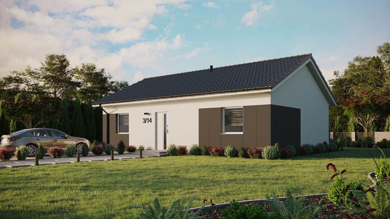 ERDOL 2 XL in der gewählten Konfiguration hat ein Satteldach ohne nutzbares Dachgeschoss mit einer Neigung von 25 Grad und ist mit EUROCOLOR SYNEGO PVC-Tischlerarbeiten auf einem 80 mm breiten Profil der Marke REHAU in den Farben Weiß ausgestattet.