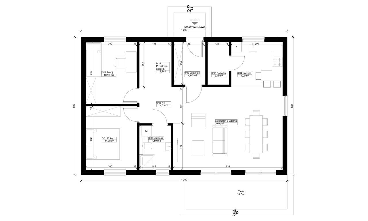 Das Haus ERDOL 2 XL mit einer Fläche von 82 m² (130 m² bei einem Projekt mit nutzbarem Dachgeschoss) ist eine erweiterte Version des Hauses ERDOL 2. Es ist eine perfekte Lösung für alle Menschen, die in ihrem Haus keine große Anzahl an Zimmern benötigen, aber den zusätzlichen Raum nutzen möchten, um mehr Platz für komfortables Arbeiten zu gewinnen. Die in diesem Projekt verwendeten modernen Technologien und ökologischen Lösungen machen es zu einem energieeffizienten Haus, das im Einklang mit der Natur funktioniert. Für den Bau wird KVH-Holz verwendet, das die Grundlage der gesamten Struktur bildet. Entsprechend ausgewählte Dämmstoffe sorgen dafür, dass das Haus vor Wärmeverlusten geschützt ist.