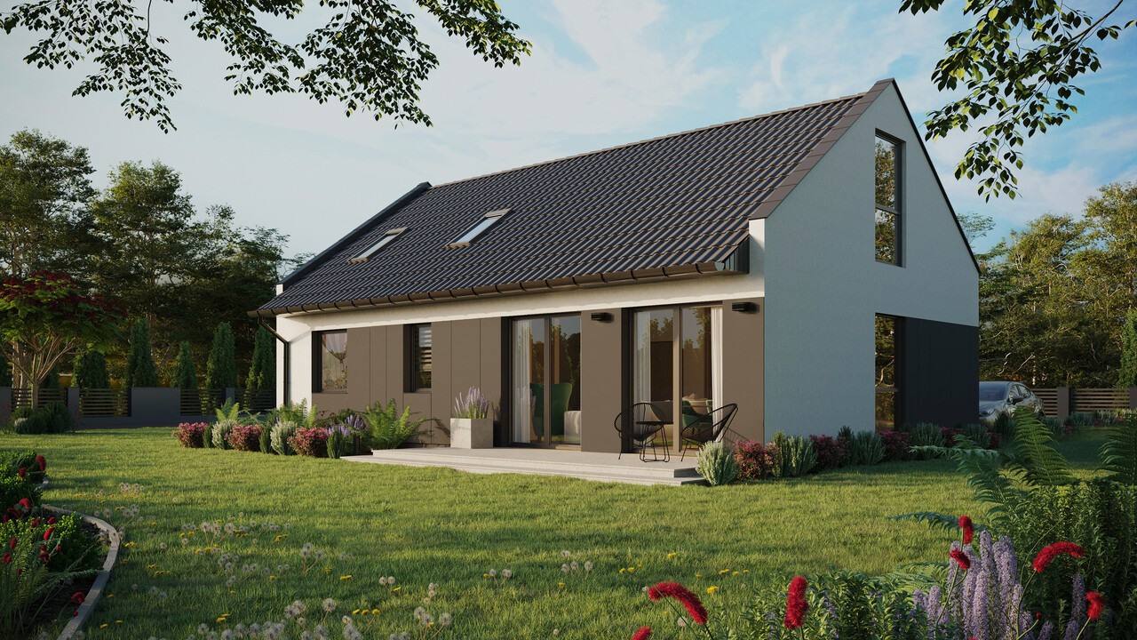 ERDOL 2 XL in der gewählten Konfiguration hat ein Modernes Satteldach mit nutzbarem Dachboden mit einem Neigungswinkel von 35 Grad und ist mit EUROCOLOR SYNEGO PVC-Tischlerarbeiten auf einem 80 mm breiten Profil der Marke REHAU in den Farben Anthrazit ausgestattet.