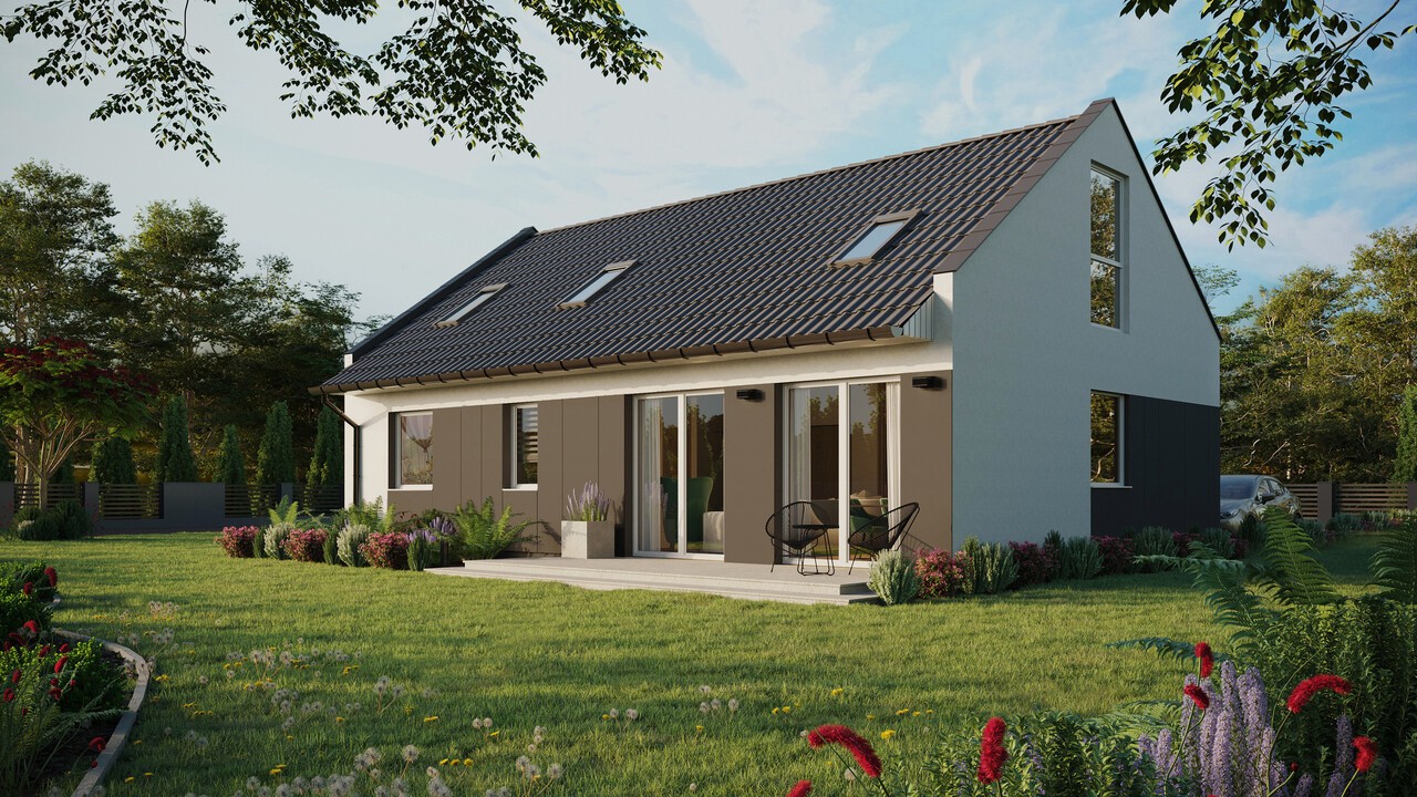 ERDOL 2 XL in der gewählten Konfiguration hat ein Modernes Satteldach mit nutzbarem Dachboden mit einem Neigungswinkel von 35 Grad und ist mit EUROCOLOR SYNEGO PVC-Tischlerarbeiten auf einem 80 mm breiten Profil der Marke REHAU in den Farben Weiß ausgestattet.