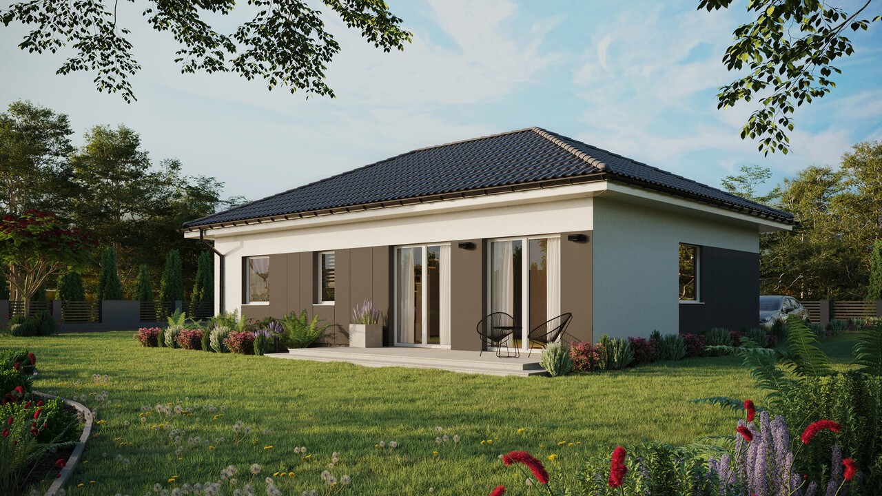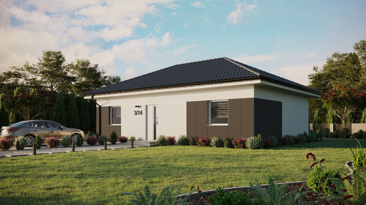 ERDOL 2 XL in der gewählten Konfiguration hat ein Walmdach mit nutzbaren Dachboden und einer Neigung von 25 Grad und ist mit EUROCOLOR SYNEGO PVC-Tischlerarbeiten auf einem 80 mm breiten Profil der Marke REHAU in den Farben Weiß ausgestattet.