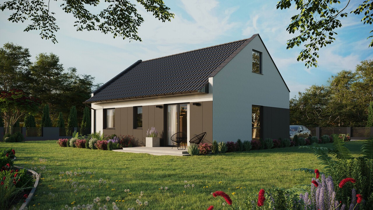 Das Haus ERDOL 2 mit einer Fläche von 68 m² (107 m² in der Version mit nutzbarem Dachgeschoss) wurde entworfen, um auf kompaktem Raum Komfort und alles zu bieten, was im täglichen Leben am wichtigsten ist. Modernste Technologien und ökologische Lösungen machen es zu einem energieeffizienten Haus, das im Einklang mit der Natur funktioniert. Für die Konstruktion wird KVH-Holz verwendet, das die Grundlage der gesamten Struktur bildet. Entsprechend ausgewählte Dämmstoffe sorgen dafür, dass das Haus vor Wärmeverlusten geschützt ist.