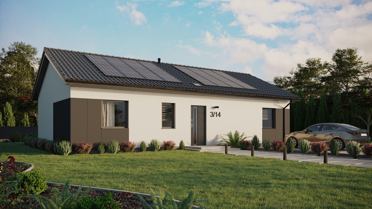 ERDOL 3 XL in der gewählten Konfiguration hat ein Satteldach ohne nutzbares Dachgeschoss mit einer Neigung von 25 Grad und ist mit EUROCOLOR SYNEGO PVC-Tischlerarbeiten auf einem 80 mm breiten Profil der Marke REHAU in den Farben Anthrazit ausgestattet.