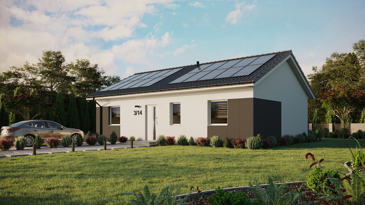 ERDOL 3 in der gewählten Konfiguration hat ein Satteldach ohne nutzbares Dachgeschoss mit einer Neigung von 25 Grad und ist mit EUROCOLOR SYNEGO PVC-Tischlerarbeiten auf einem 80 mm breiten Profil der Marke REHAU in den Farben Weiß ausgestattet.
