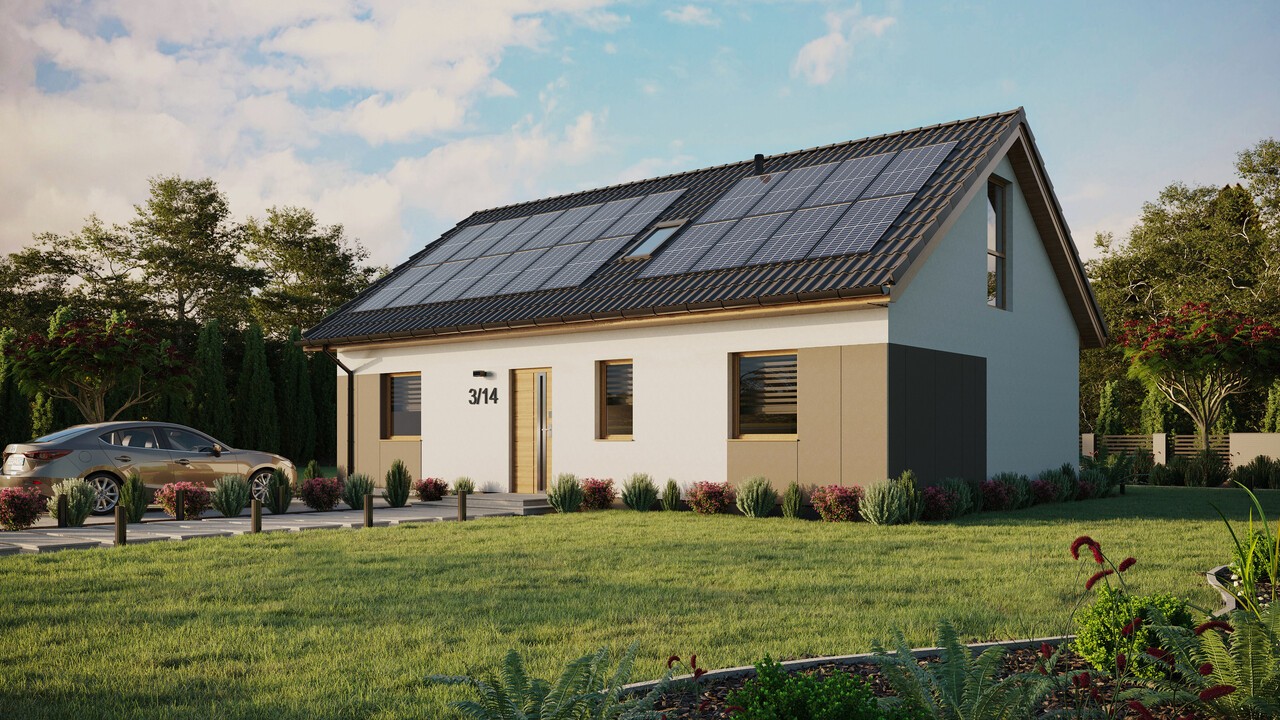 ERDOL 3 in der gewählten Konfiguration hat ein Satteldach mit nutzbarem Dachgeschoss mit einer Neigungswinkel 35 Grad und ist mit EUROCOLOR SYNEGO PVC-Tischlerarbeiten auf einem 80 mm breiten Profil der Marke REHAU in den Farben Winchester ausgestattet.