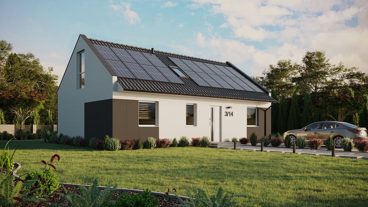 ERDOL 3 in der gewählten Konfiguration hat ein Modernes Satteldach mit nutzbarem Dachboden mit einem Neigungswinkel von 35 Grad und ist mit EUROCOLOR SYNEGO PVC-Tischlerarbeiten auf einem 80 mm breiten Profil der Marke REHAU in den Farben Weiß ausgestattet.